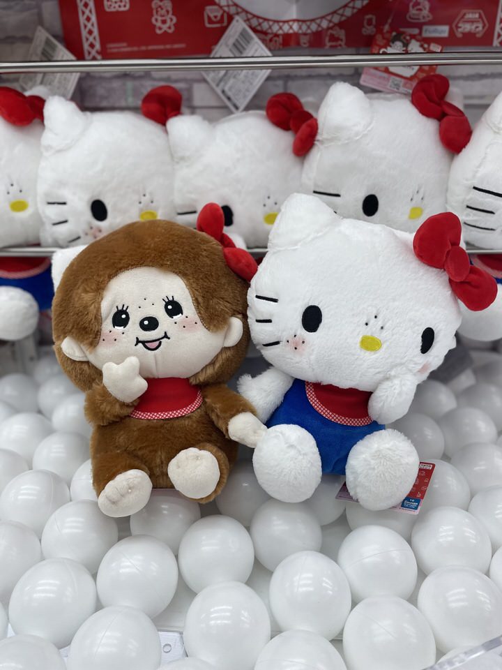 入荷いたしました!モンチッチはキティちゃんのおみみをキティはモンチッチのそばかすを付けたコラボぬいぐるみになってます❤️🧸とてもかわいいのでぜひGETしに来て下さい♪ ご来店お待ちしております🙌🏻